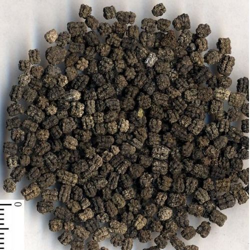 蚕沙呈颗粒状六棱形,长2-5mm,直径1.5-3mm。表面灰黑色或黑绿色,粗糙,有6条明显的纵绝及横向浅沟纹。气微,味淡。粪便呈短圆柱形颗粒状,长2--5mm,直径1.5--3mm。表面灰黑色或灰棕色。纵向有六条棱脊,棱上横向有3--4条浅沟,粗沟,粗糙显麻纹状。质坚硬,不易碎(遇潮后易散碎)。微有青草气。以干燥、色黑、坚实、均匀、无杂质者为佳。